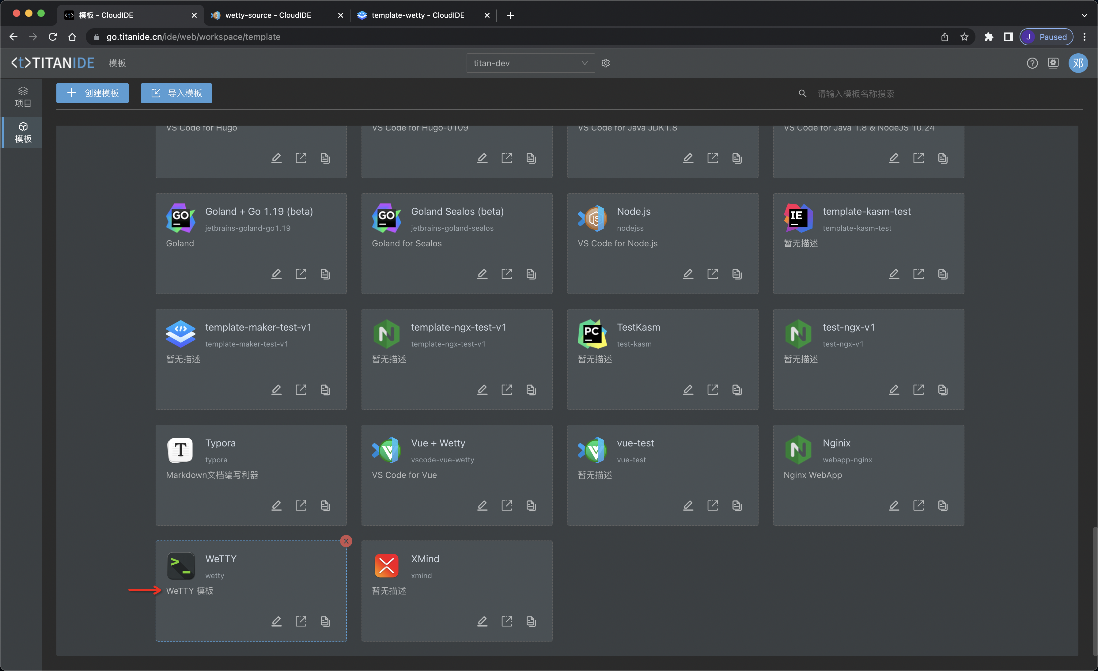 然后使用 WeTTY 模板镜像 titan.hub:5000/demo/template-wetty:v20230131-1b25d1b 创建 WeTTY 模版: